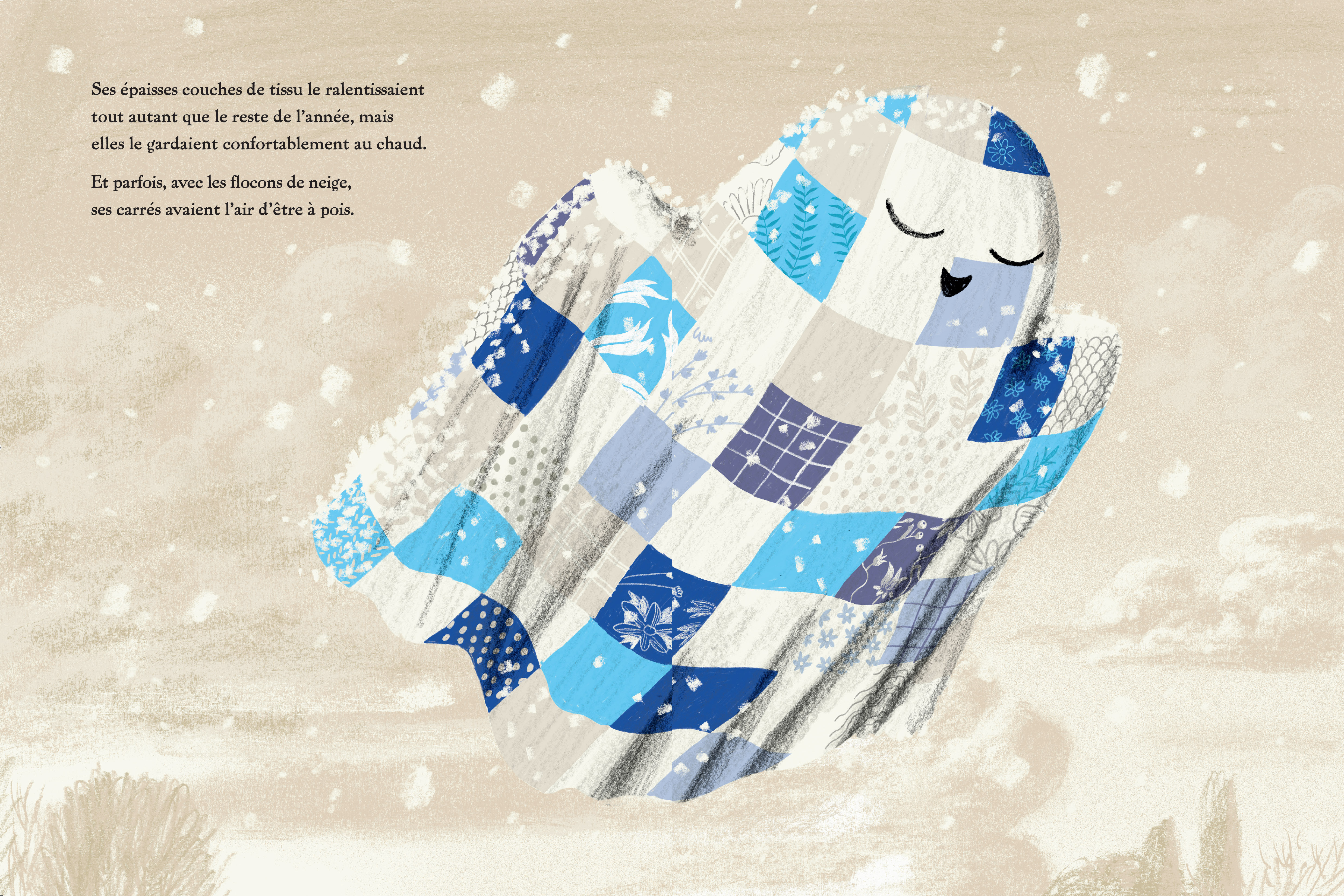 Le petit fantôme en édredon adore voler dans le ciel d'hiver. Son duvet lui tient bien chaud ! Mais ses amis fantômes en draps, eux, craignent trop le froid et ne mettent jamais un bout de tissu dehors.