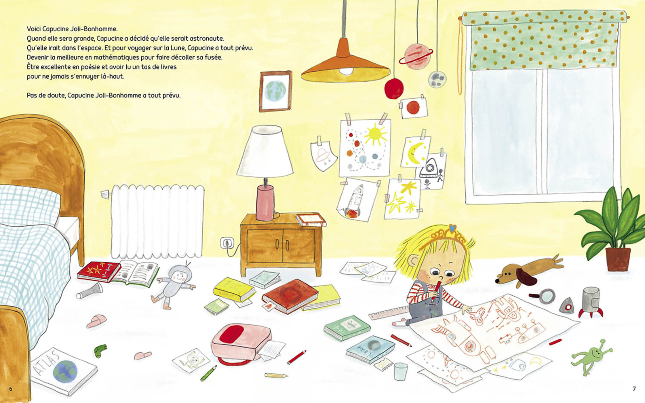 Il faut qu'elle soit la meilleure en mathématiques pour faire décoller sa fusée et pour pouvoir la réparer si elle tombe en panne. Il faut qu'elle soit aussi excellente en poésie et avoir lu un tas de livres pour ne jamais s'ennuyer là-haut et se raconter tous les jours de nouvelles histoires.