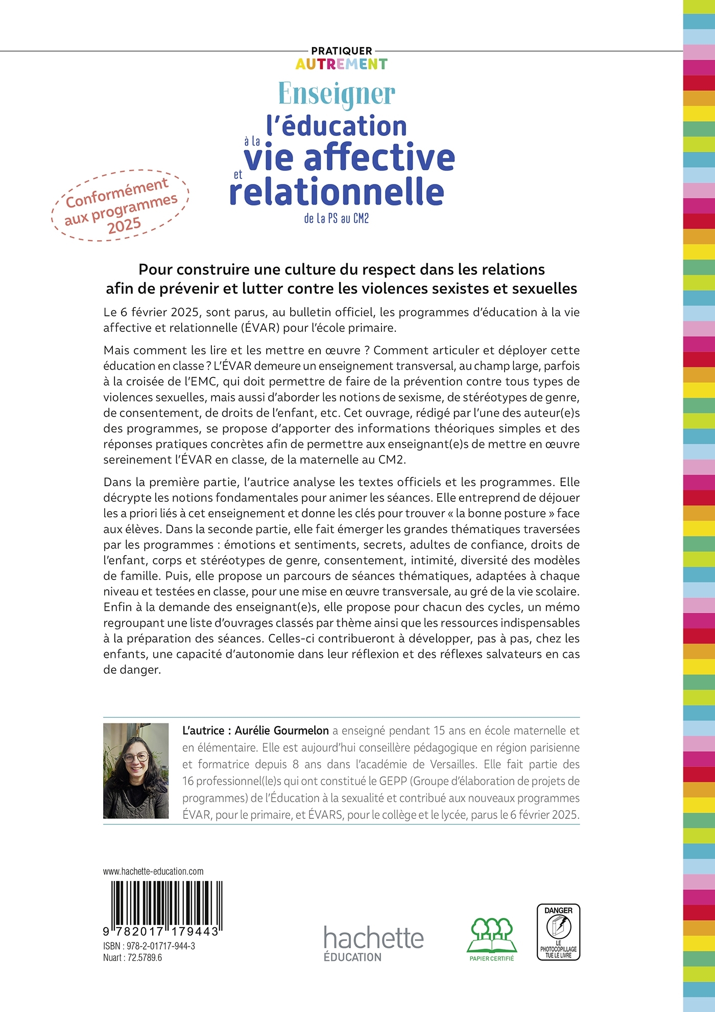 Ce nouvel ouvrage, rédigé par Aurélie Gourmelon, une des auteurs du Groupe d’élaboration des projets de programmes de l’Éducation à la sexualité, se propose d’apporter à la fois des informations théoriques simples et des réponses pratiques concrètes, à la lumière des nouveaux programmes d’éducation à la vie affective et relationnelle (ÉVAR) pour l’école primaire, pour permettre aux enseignant(e)s de mettre en œuvre sereinement l’éducation à la sexualité en classe, de la maternelle au CM2.L’éducation à la vie affective et relationnelle demeure un enseignement transversal, au champ large, parfois à la croisée de l’EMC, qui doit permettre de faire de la prévention contre tous types de violences sexuelles, mais aussi d’aborder les notions de sexisme, de stéréotypes de genre, de consentement, des droits de l’enfant, etc. Les points forts et les nouveautés :Conçu par l’un des auteurs des programmes 2025.Un ouvrage pratique clés en main, avec des fiches de préparation complètes qui permettent de mettre en œuvre facilement les séances en classe.Des photofiches élèves photocopiables et téléchargeables.Un tableau inversé des programmes structuré par entrées thématiques, pour faciliter leur lecture et permettre de repérer les notions à cheval sur l’EMC. L’ensemble du parcours de l’éducation à la vie affective et relationnelle, de la PS au CM2.Une carte mentale mettant en évidence la transversalité de l’enseignement de l’ÉVAR. Des “mallettes” de l’enseignant(e), pour chaque niveau, avec la liste des ouvrages sur lesquels il ou elle peut s’appuyer. Une bibliographie ciblée d’albums de jeunesse récents.Un accent particulier porté sur les stéréotypes de genre et les discriminations.Les chiffres et les données les plus récents pour favoriser la prise de conscience des enjeux et étayer l’enseignement.