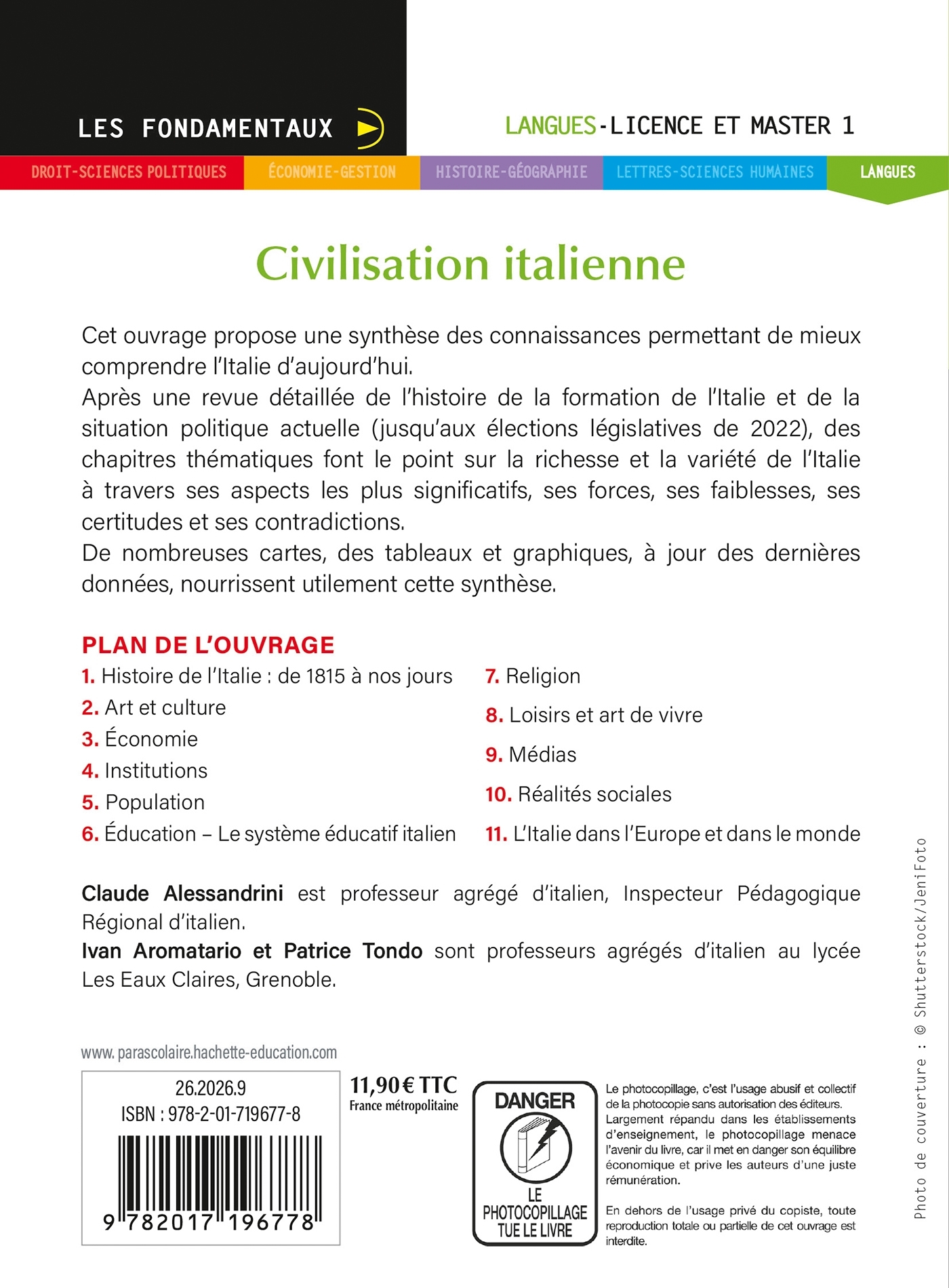 Après une revue détaillée de l’histoire de la formation de l’Italie et de la situation politique actuelle (jusqu’aux élection législatives de 2022), des chapitres thématiques font le point sur la richesse et la variété de l’Italie à travers ses aspects les plus significatifs, ses forces, ses faiblesses, ses certitudes et ses contradictions.