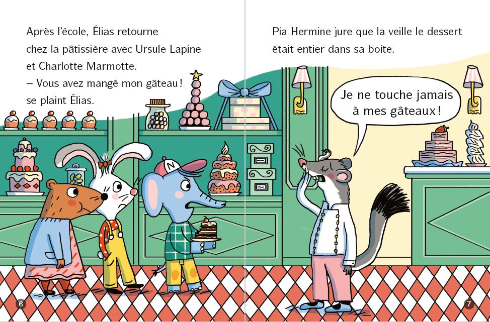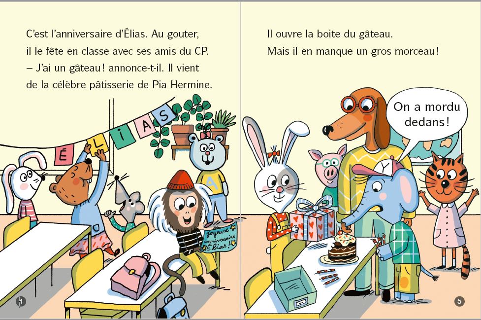 C'est l'anniversaire d'Elias, l'éléphanteau. Pour souffler ses bougies, il sort son beau gâteau. Mais quand Elias ouvre la boîte : il manque un gros morceau ! Vite, il faut demander à Pia Hermine, la célèbre pâtissière. Pourtant, Pia est sûre, il était entier dans son frigo.
