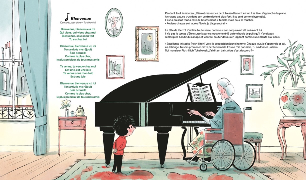 Dans ce merveilleux conte musical, la vieille dame est la bonne fée qui va changer la vie du petit garçon. Cette histoire de transmission et de réparation à travers la musique est racontée par Guillaume Gallienne, sociétaire de la comédie française, dont la voix nous envoûte. Il prend à la perfection l'accent russe de la vieille pianiste (il a lui-même des origines russo-géorgiennes). Le texte, dense et vivant, est entrecoupé de morceaux de musique ou de chansons. Une véritable initiation à la musique qui fera découvrir les grands morceaux de Mozart, Beethoven, Chopin ou Debussy. Avec un CD et un QR code.