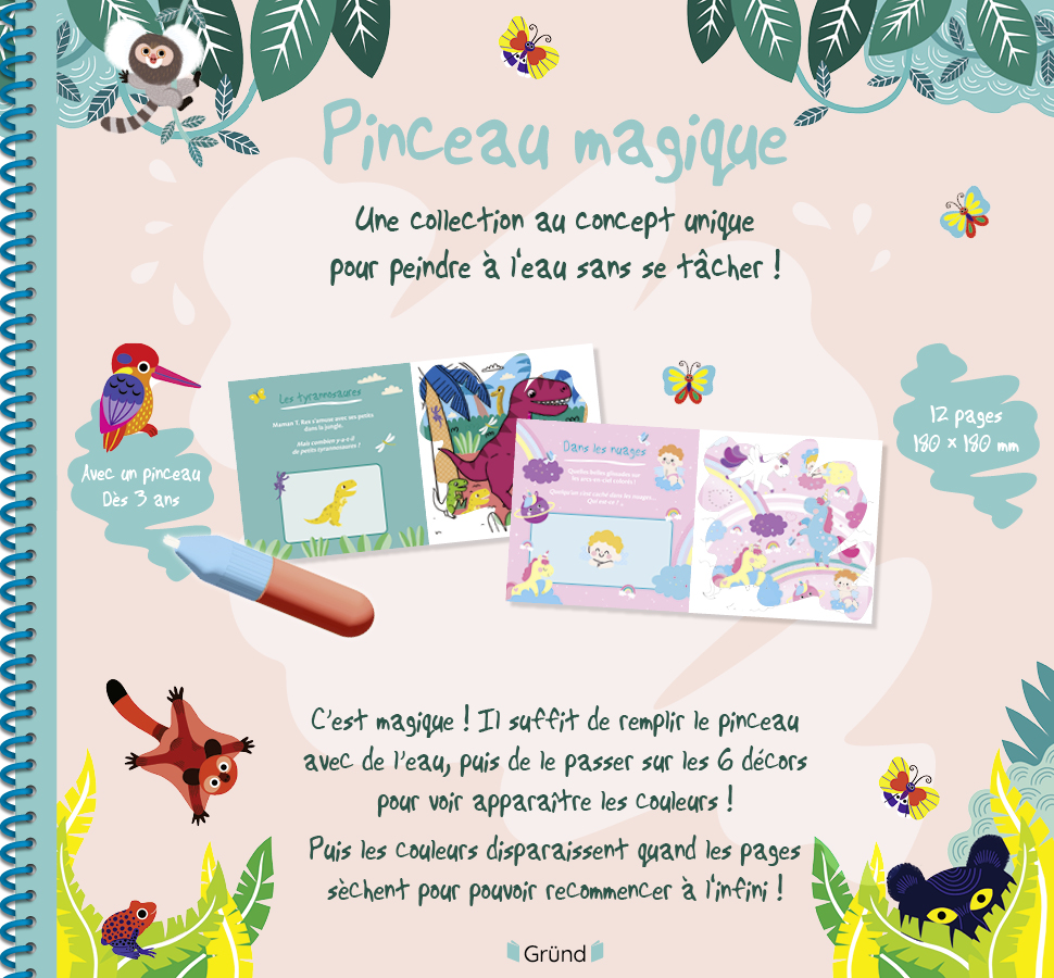 C'est magique ! Il suffit de remplir son pinceau avec de l'eau, puis de le passer sur les 6 décors du carnet pour voir apparaître les magnifiques scènes : le chapiteau, le début du spectacle, les clowns, les magiciens, les funambules et les acrobates ! Attends un peu : les décors disparaissent quand les pages sèchent pour pouvoir recommencer à l'infini !