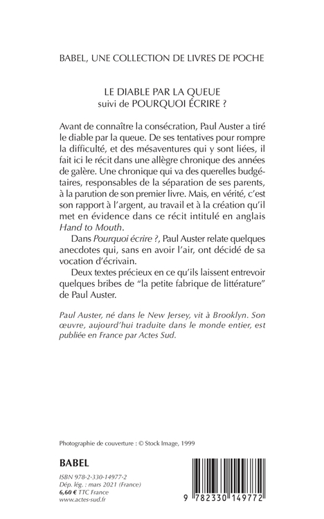 Avant de connaître la consécration, Paul Auster a tiré le diable par la queue. De ses tentatives pour rompre la difficulté, et des mésaventures qui y sont liées, il fait ici le récit dans une allègre chronique des années de galère. Une chronique qui va des querelles budgétaires, responsables de la séparation de ses parents, à la parution de son premier livre. Mais, en vérité, c'est son rapport à l'argent, au travail et à la création qu'il met en évidence dans ce récit intitulé en anglais Hand to Mouth. Dans «Pourquoi écrire» ?, Paul Auster relate quelques anecdotes qui, sans en avoir l'air, ont décidé de sa vocation d'écrivain. Deux textes précieux en ce qu'ils laissent entrevoir quelques bribes de la petite fabrique de littérature de Paul Auster.