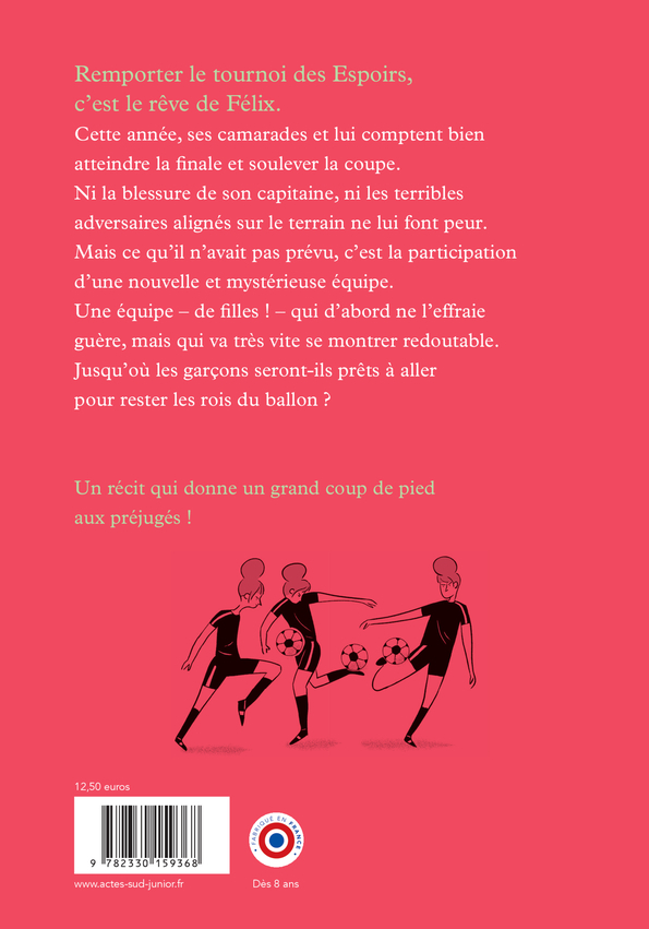 Remporter le tournoi des Espoirs, c'est le rêve de Félix. Cette année, ses camarades et lui comptent bien atteindre la finale et soulever la coupe. Ni la blessure de son capitaine, ni les terribles adversaires alignés sur le terrain ne lui font peur. Mais ce qu'il n'avait pas prévu, c'est la participation d'une nouvelle et mystérieuse équipe. Une équipe - de filles ! - qui d'abord ne l'effraie guère, mais qui va très vite se montrer redoutable. Jusqu'où les garçons seront-ils prêts à aller pour rester les rois du ballon ? Un récit qui donne un grand coup de pied aux préjugés ! EXTRAIT