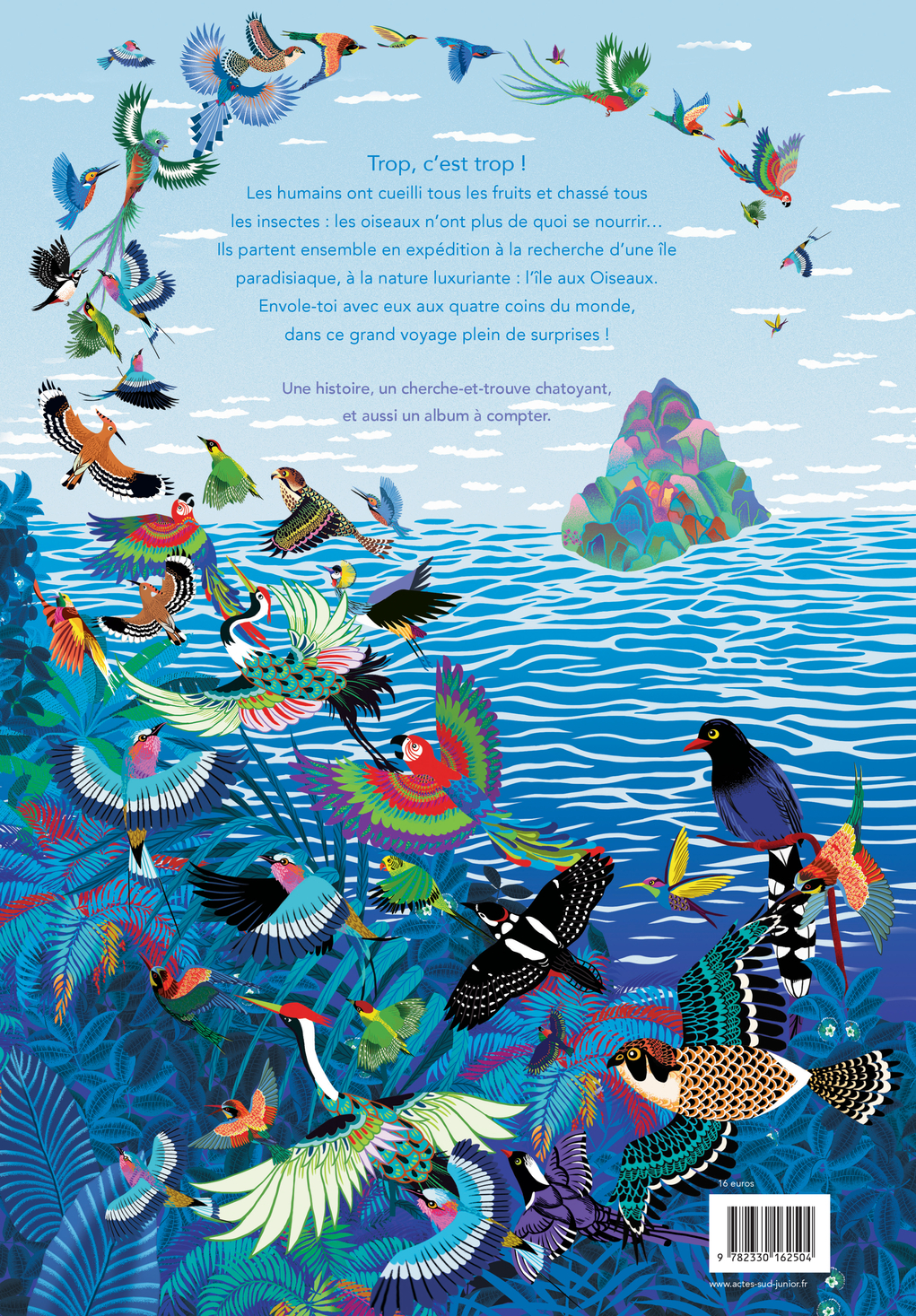 Envolez-vous aux côtés des plus beaux oiseaux du monde ! Dans leur verger, les colibris se lamentent... Les humains ont tellement rasé les terres qu'ils n'ont plus assez de fruits pour se nourrir ! Un peu plus loin, ce sont les guêpiers qui crient famine. Pour les mêmes raisons, les abeilles dont ils se régalaient ont disparu. L'un d'eux a entendu parler d'une île merveilleuse, une île protégée des humains où toutes les espèces vivent dans l'abondance. Les oiseaux décident alors de partir pour un long voyage, à la recherche de cette île promise. De page en page, la petite troupe s'étoffe. Les faucons, les piverts et les flamants roses volent d'un même élan, portés par l'espoir, et parent de mille couleurs les pages de ce magnifique album écologiste. Apprendre à compter n'a jamais été aussi ludique ! LIRE UN EXTRAIT « L'illustratrice Peggy Nille est au sommet de son art : on a envie d'encadrer chaque page de cet album magnifique » Olivia de Lamberterie, magazine« ELLE»