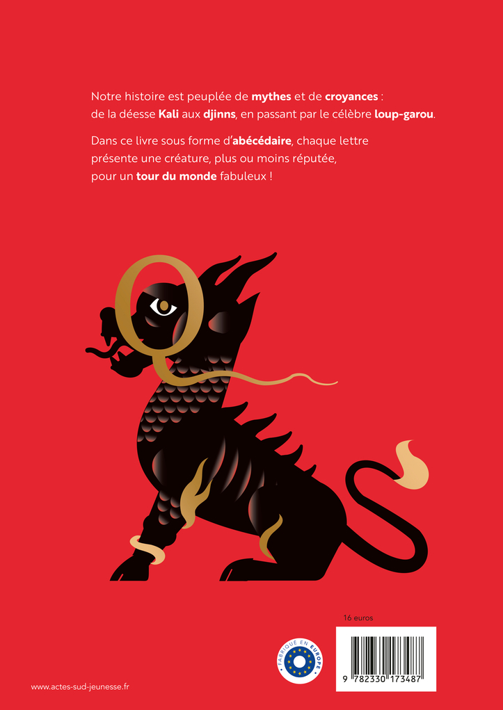 Un documentaire sous forme d'abécédaire, pour découvrir 26 créatures du monde entier qui habitent nos imaginaires. Des célèbres cyclopes aux djinns, en passant par Kali, la déesse hindoue de la mort et du temps, ou encore le Namazu, dans ce livre, chaque lettre de l'alphabet présente un monstre qui peuple nos croyances. Présentés brièvement, ces êtres, pas toujours connus, prennent vie dans de magnifiques illustrations stylisées où domine le rouge. Pour initier les plus jeunes aux mythes et légendes et partir à la découverte de fabuleuses histoires!