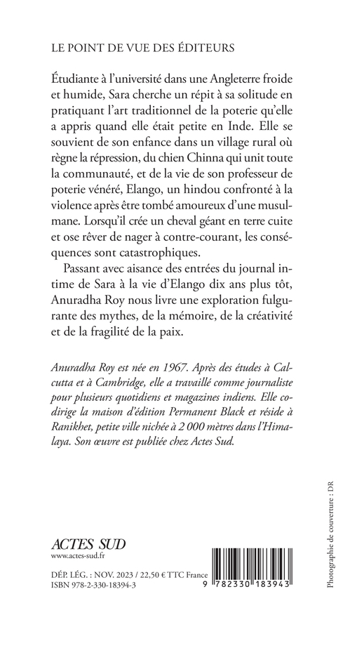 Étudiante à l'université dans une Angleterre froide et humide, Sara cherche un répit à sa solitude en pratiquant l'art traditionnel de la poterie qu'elle a appris quand elle était petite en Inde. Elle se souvient de son enfance dans un village rural où règne la répression, du chien Chinna qui unit toute la communauté, et de la vie de son professeur de poterie vénéré, Elango, un hindou confronté à la violence après être tombé amoureux d'une musulmane. Lorsqu'il crée un cheval géant en terre cuite et ose rêver de nager à contre-courant, les conséquences sont catastrophiques. Passant avec aisance des entrées du journal intime de Sara à la vie d'Elango dix ans plus tôt, Anuradha Roy nous livre une exploration fulgurante des mythes, de la mémoire, de la créativité et de la fragilité de la paix.