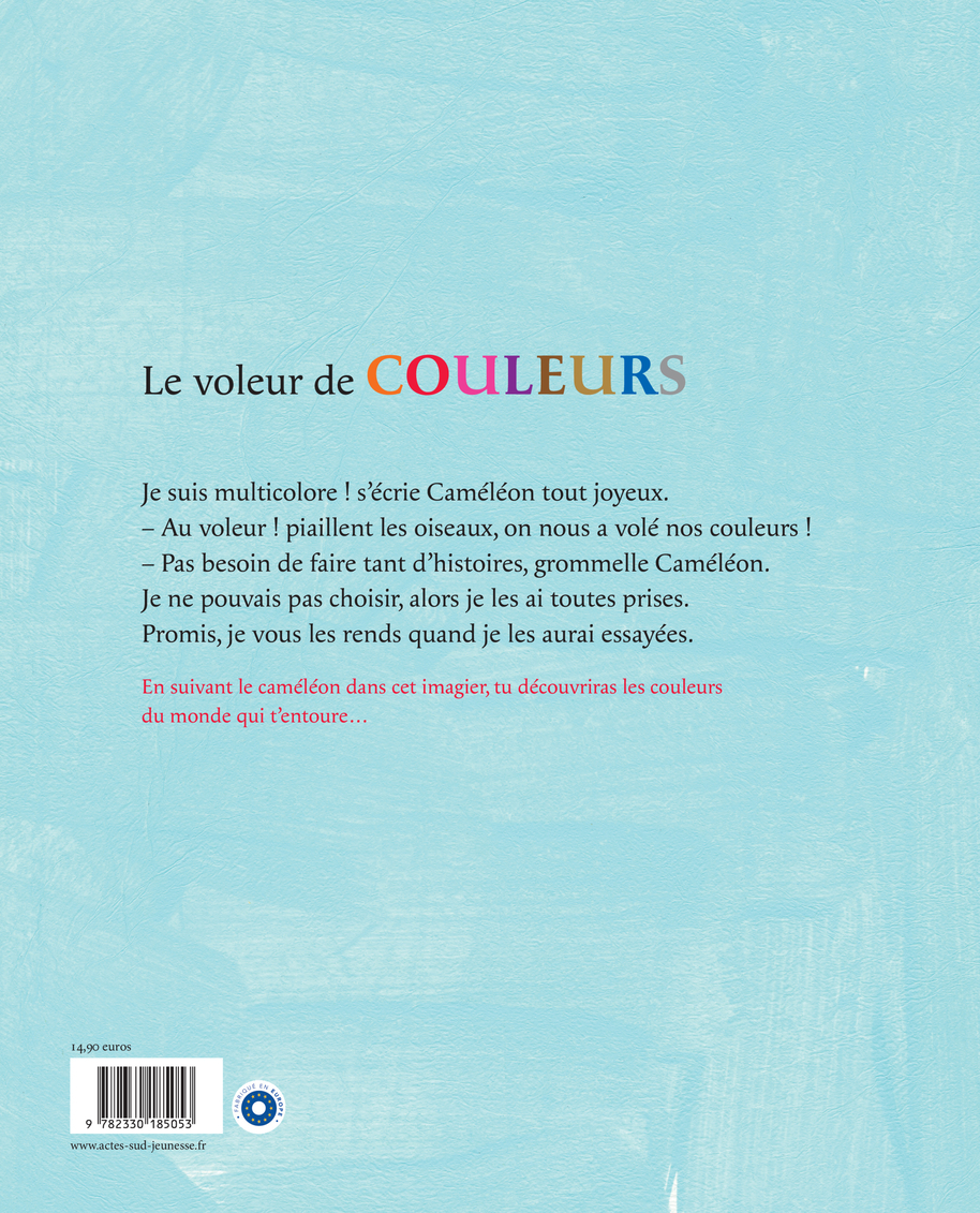 Dans ce livre, chaque double page présente une couleur et ses nuances à travers une foule d'objets familiers : les produits laitiers pour le blanc, les animaux d'Afrique pour le gris, les chaussures pour le noir. Tasses, bouilloires et cafetières se déclinent en toutes sortes de bleus, lézards et batraciens en vert, engins de construction en jaune, fruits en orange, vêtements en rouge... Le caméléon, lui, nous livre un joli poème pour nous accompagner dans chacune de ces couleurs et, bien sûr, change de robe à chaque fois ! Un livre parfait pour apprendre les noms des couleurs, et pour élargir son vocabulaire. Et aussi un magnifique travail d'artiste ! LIRE UN EXTRAIT