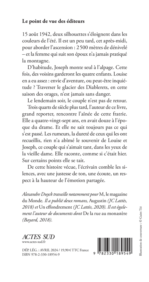 15 août 1942, deux silhouettes s'éloignent dans les couleurs de l'été. Il est un peu tard, cet après-midi, pour aborder l'ascension : 2 500 mètres de dénivelé - et la femme qui suit son époux n'a jamais pratiqué la montagne. D'habitude, Joseph monte seul à l'alpage. Cette fois, des voisins garderont les quatre enfants. Louise en a eu assez : envie d'aventure, ou peut-être inquiétude ? Traverser le glacier des Diablerets, en cette saison des orages, n'est jamais sans danger. Le lendemain soir, le couple n'est pas de retour. Trois quarts de siècle plus tard, l'auteur de ce livre, grand reporter, rencontre l'aînée de cette fratrie. Elle a quatre-vingt-sept ans, en avait douze à l'époque du drame. Et elle ne sait toujours pas ce qui s'est passé. Les rumeurs, la dureté de ceux qui les ont recueillis, rien n'a abîmé le souvenir de Louise et Joseph, ce couple qui s'aimait tant, dans les yeux de la vieille dame. Elle raconte, comme si c'était hier. Sur certains points elle se tait. De cette histoire vécue, l'écrivain comble les silences, avec une justesse de ton, une écoute, un respect à la hauteur de l'émotion partagée.