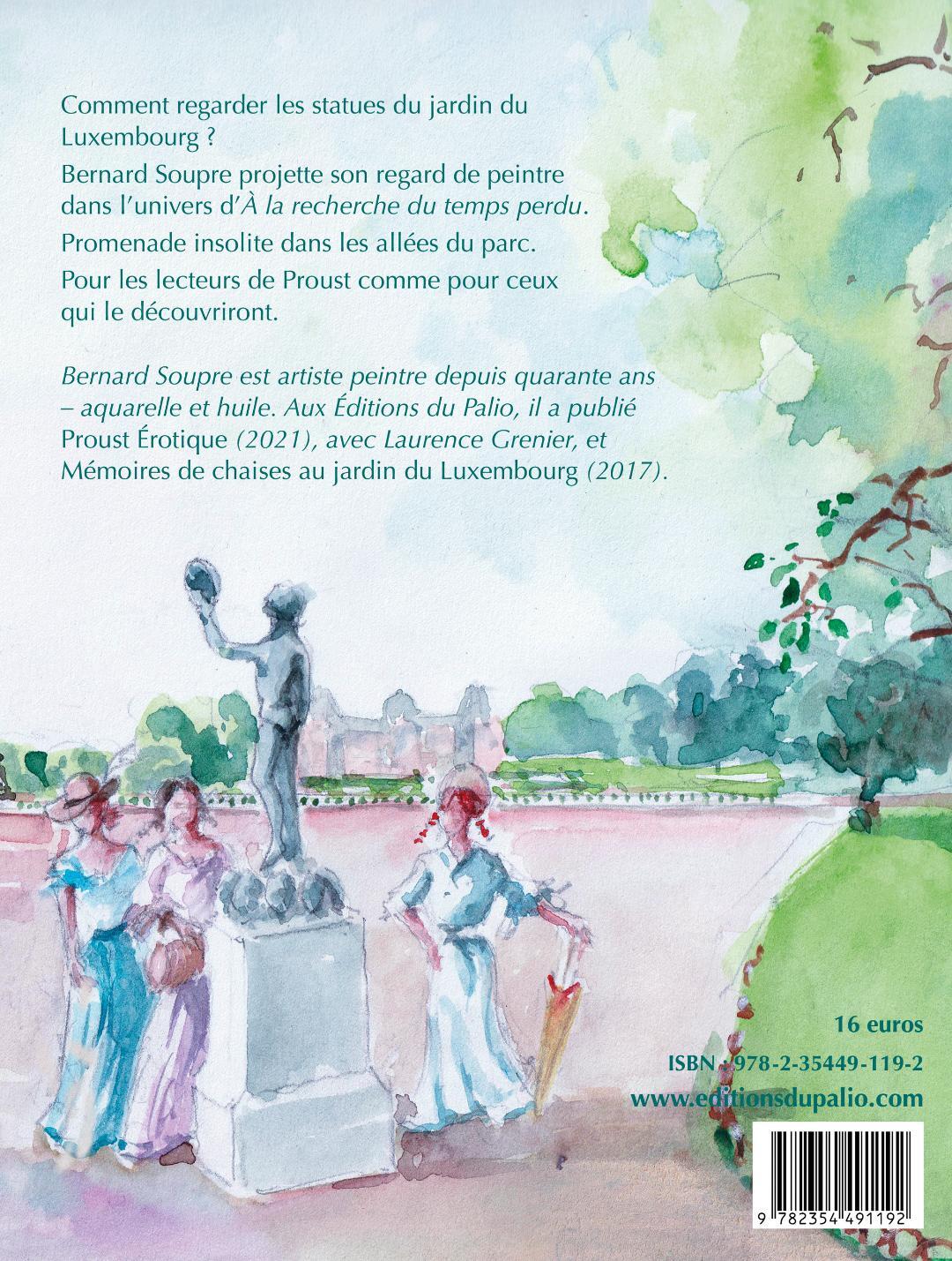 Le plus proustien des jardins parisiens ne figure pas dans À la recherche du temps perdu. On y voit les Champs-Élysées, les Buttes-Chaumont, Bagatelle et le Trocadéro, mais du Luxembourg il n'est pas directement question.<br /><br /> De tous les parcs de la capitale, le Luco est pourtant celui où souffle le plus l'esprit de la Recherche. Pas une sculpture, ou presque, qui ne fasse écho à quelque passage du roman ! Dans les allées du Luxembourg, comme les parfums, les couleurs et les sons du poète, les statues et les rêveries du lecteur se répondent.<br /><br /> L'expérience vaut d'être tentée. Sur l'une de ces chaises fameuses, asseyez-vous un moment en face de George Sand : vous voilà emporté dans une petite chambre, un soir, du côté de Combray, avant d'être entraîné dans la bibliothèque du prince de Guermantes. Installez-vous devant le Marchand de masques, c'est le kaléidoscope de la littérature qui vous donne le vertige.<br /><br /> Quel plaisir d'apercevoir, comme dans la vraie vie, la dame de Nohant à deux pas de Flaubert et Stendhal !<br /><br /> Bernard Soupre peint le Luxembourg depuis trente ans. Ce sont d'abord les chaises, d'un genre longtemps unique, qui ont inspiré son pinceau. On les retrouve dans les Mémoires de chaises au jardin du Luxembourg, son livre consacré aux grands auteurs qui ont évoqué le parc.<br /><br /> Ici, c'est le parc qui évoque les grands auteurs. Bernard Soupre, lecteur gourmand et parfois farceur d'À la recherche du temps perdu, s'est livré à l'expérience du dialogue avec les statues, en artiste se jouant des anachronismes - tel le narrateur. De cette conversation intérieure est née l'idée des Mémoires de Proust au jardin du Luxembourg. Éclairage de la Recherche hors des sentiers battus pour le connaisseur. Entrée en matière pittoresque pour le promeneur qui la découvre.<br /><br /> Bernard Soupre est artiste peintre depuis quarante ans - aquarelle et huile. Aux Éditions du Palio, il a publié Proust Érotique (2021), avec Laurence Grenier, et Mémoires de chaises au jardin du Luxembourg (2017).<br />