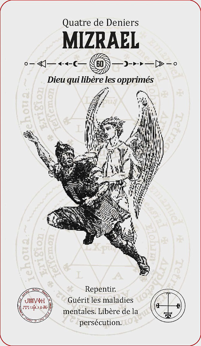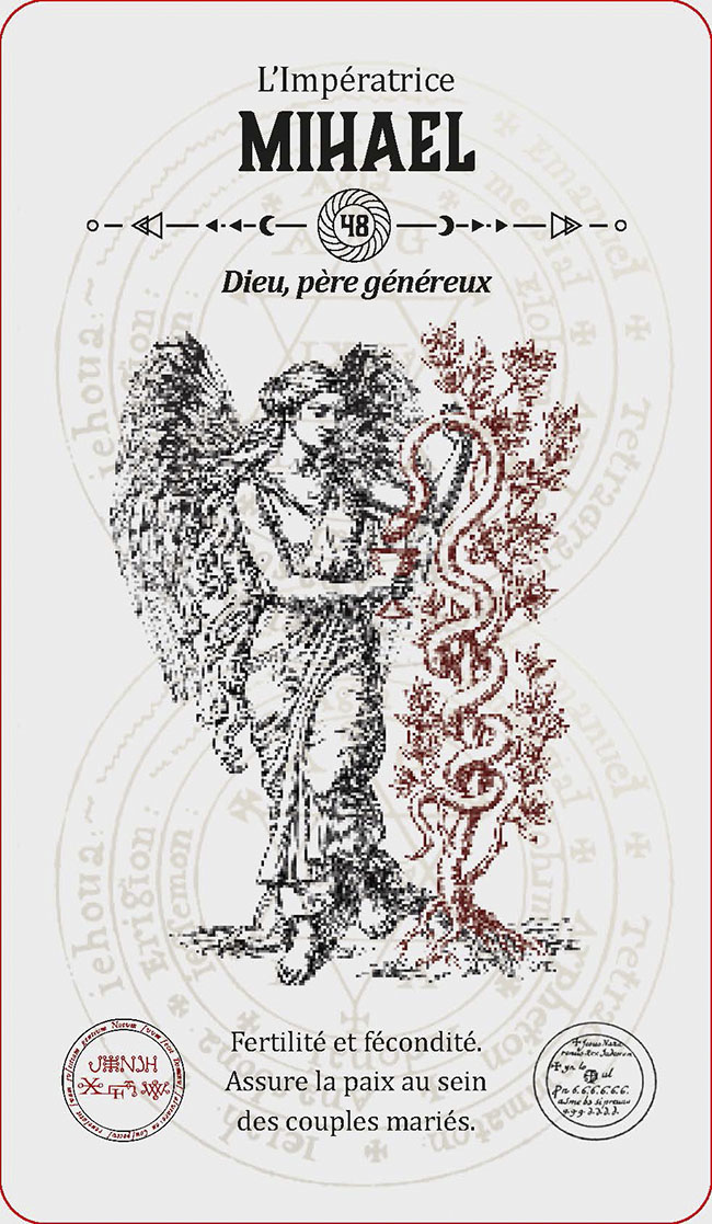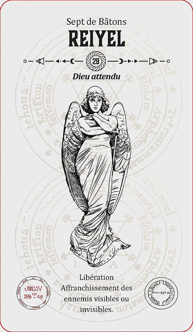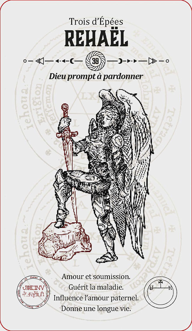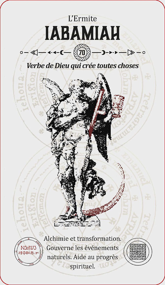 INTRODUCTION 1LA HIÉRARCHIE DES ANGES 3CONJURATION DES ESPRITS ANGÉLIQUES 7LE GRAND PENTACLE DE SALOMON 9INVOQUER ET CONGÉDIER LES ESPRITS ANGÉLIQUES 11UTILISER LE TAROT D'ÉVOCATION DES ANGES 17LE TAROT ANGÉLIQUE : SIGNIFICATIONS 23L'archange Michel :semblable à Dieu 25L'archange Métatron :l'ange archiviste 26L'archange Gabriel :Dieu est ma force 27L'archange Haniel :la grâce de Dieu 28L'archange Camaël :la rigueur de Dieu 29L'archange Uriel :le feu de Dieu 30Les 72 anges 311 Vehuiah : Dieu exaltant 322 Jeliel : Dieu secourable 333 Sitaël : Dieu de l'espoir 344 Elemiah : Dieu caché 355 Mahasiah : Dieu sauveur 366 Lelahel : Dieu louable 377 Achaiah : Dieu bon et patient 388 Cahethel : Dieu adorable 399 Haziel : Dieu de miséricorde 4010 Aladiah : Dieu propice 4111 Lauvuel : Dieu exalté 4212 Hahaiah : Dieu refuge 4313 Yezalel : Dieu glorifiésur toutes choses 4414 Mebahel : Dieu protecteur 4515 Hariel : Dieu réconfortant 4616 Hakamiah : Dieu qui érigel'univers 4717 Lauviah : Dieu admirable 4818 Caliel : Dieu invocable 4919 Leuviah : Dieu promptà écouter 5020 Pahaliah : Dieu rédempteur 5121 Nelchael : Dieu seul et unique 5222 Ieiaiel : la main droite de Dieu 5323 Melahel : Dieu qui dévie le mal 5424 Hahuiah : Dieu bon parlui-même 5525 Nith-Haïah : Dieu généreux 5626 Haaiah : Dieu écoutanten cachette 5727 Ierathel : Dieu prévenant 5828 Séheiah : Dieu qui prit le mal 5929 Reiyel : Dieu attendu 6030 Omael : Dieu patient 6131 Lecabel : Dieu qui enseigne 6232 Vasariah : Dieu juste 6333 Iehuiah : Dieu qui connaîttoutes choses 6434 Lehahiah : Dieu clément 6535 Chavakiah : Dieu de la joie 6636 Menadel : Dieu honorable 6737 Aniel : Dieu, seigneurde toutes les vertus 6838 Haamiah : Dieu, l'espérancede toute la Terre 6939 Rehaël : Dieu promptà pardonner 7040 Ieiazel : Dieu qui réjouit 7141 Hahahel : Dieu de La Trinité 7242 Michaël : semblable à Dieu 7343 Veualiah : Dieu, roi et souverain 7444 Ielahiah : Dieu éternel 7545 Sealiah : Dieu, moteurde tous les hommes 7646 Ariel : Dieu révélateur 7747 Asaliah : Dieu, juge juste 7848 Mihael : Dieu, père généreux 7949 Vehuel : Dieu grand et élevé 8050 Daniel : Dieu, jugemiséricordieux 8151 Hahasiah : Dieu, secretimpénétrable 8252 Imamiah : Dieu, caché dansl'obscurité 8353 Nanaël : Dieu qui abaisseles orgueilleux 8454 Nithaël : Dieu, roi des cieux 8555 Mebahiah : Dieu éternel 8656 Poïel : Dieu qui soutientl'univers 8757 Nemamiah : Dieu aimable 8858 Ieialel : Dieu qui entend leslamentations 8959 Harahel : Dieu omniprésent 9060 Mizrael : Dieu qui libèreles opprimés 9161 Umabel : Dieu élevéau-dessus de tous les noms 9262 Iah-hel : Dieu, être suprême 9363 Anaüel : Dieu infiniment bon 9464 Mehiel : Dieu vivifiant 9565 Damabiah : Dieu, fontainede sagesse 9666 Manakel : Dieu qui seconde etentretient toutes choses 9767 Eyael : Dieu, délice des enfantsdes hommes 9868 Habuhiah : Dieu, le plus aimabledes donateurs 9969 Rochel : Dieu qui voit tout 10070 Iabamiah : mot de Dieuqui crée toutes choses 10171 Haiaiel : Dieu, maîtrede l'univers 10272 Mumiah : Dieu, la finde toutes choses 103À PROPOS DE L'AUTEUR 105