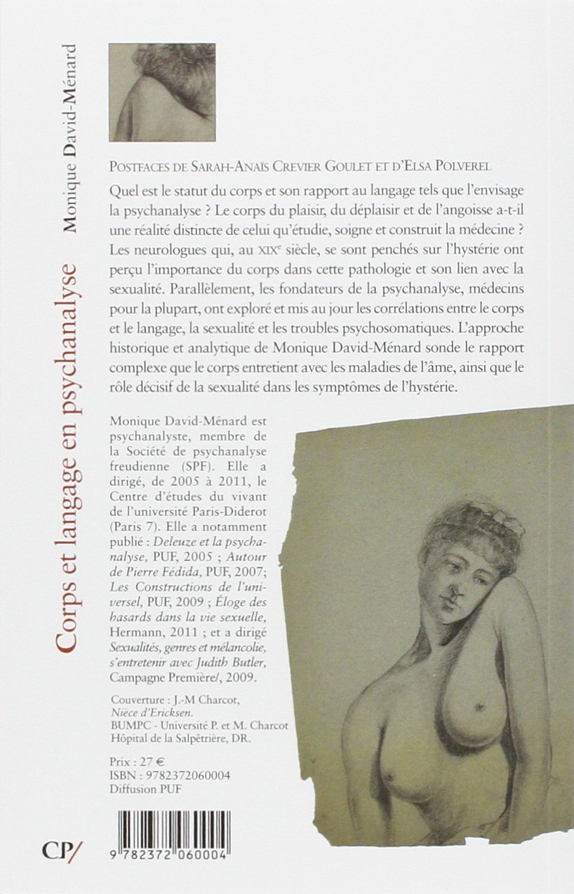 Quel est le statut du corps et son rapport au langage tels que l'envisage la psychanalyse ? Le corps du plaisir, du déplaisir et de l'angoisse a-t-il une réalité distincte de celui qu'étudie, soigne et construit la médecine ? Les neurologues qui, au XIXe siècle, se sont penchés sur l'hystérie ont perçu l'importance du corps dans cette pathologie et son lien avec la sexualité. Parallèlement, les fondateurs de la psychanalyse, médecins pour la plupart, ont exploré et mis au jour les corrélations entre le corps et le langage, la sexualité et les troubles psychosomatiques. L'approche historique et analytique de Monique David-Ménard du corps sonde le rapport complexe que celui-ci entretient avec les maladies de l'âme, ainsi que le rôle décisif de la sexualité dans les symptômes de l'hystérie.