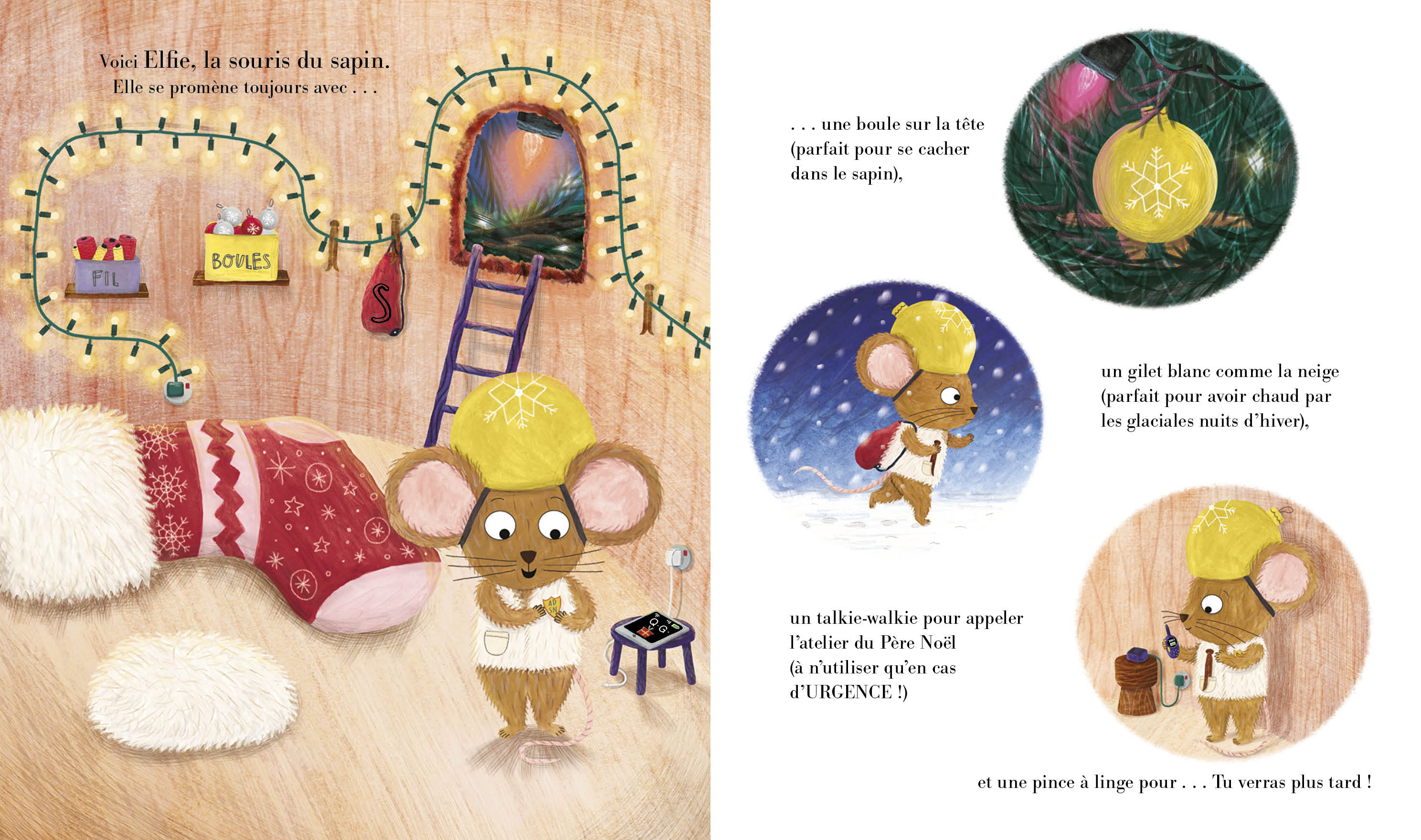C'était le soir de Noël. Dans toute la maison, rien ne bougeait, sauf Elfie. . . la souris du sapin.' Car elle est chargée d'une mission importante : aider le Père Noël ! Chaque veille de Noël, cette petite souris, aussi sage qu'une décoration, efface les empreintes enneigées du Père Noël, grignote les miettes de biscuits, balaie les crottes des rennes... et, plus important encore, vérifie sur son ardoise magique que le Père Noël a déposé les bons cadeaux sous le sapin. Mais quand elle découvre que bébé Lou a reçu le mauvais cadeau, il y a URGENCE ! Son courage et sa détermination suffiront-ils à sauver le Noël de Lou ? Les enfants vont être émerveillés par cette souris du sapin. Et s'ils découvraient, à la maison, une décoration qui lui ressemble ? Une belle histoire, superbement illustrée, avec de la dorure sur la couverture, pour entourer le sapin de Noël de mystère et de magie.