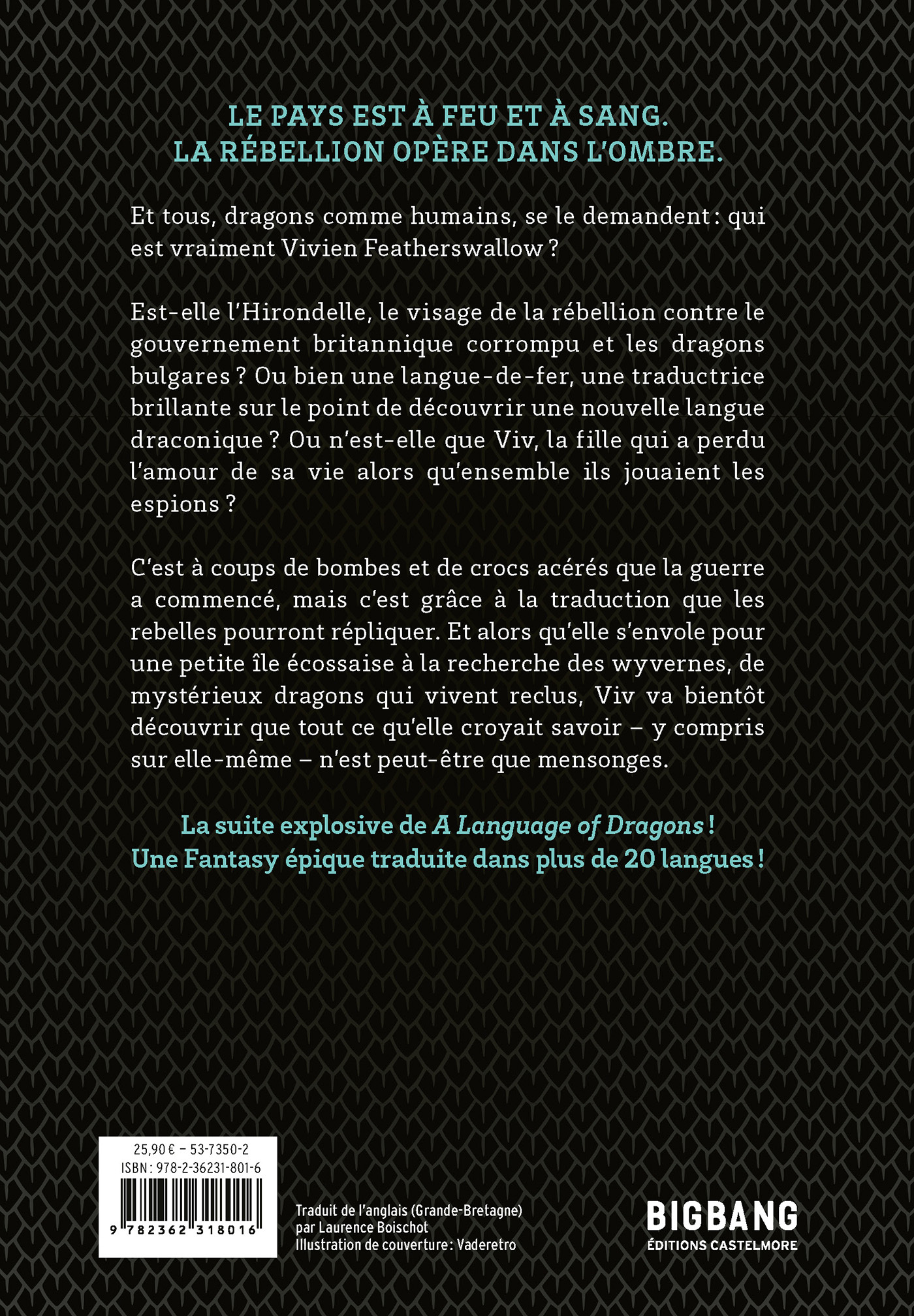 Vivien Featherswallow a réussi à traduire la langue secrète des dragons.Mais osera-t-elle s'en servir pour remporter la guerre ?La guerre civile fait rage. Ayant fui Bletchley Park et l'influence de la Première ministre Wyvernmire, Vivien doit se contenter d'oeuvrer dans l'ombre. À son insu, son alliée et mentor a fait d'elle le visage de la rébellion - et l'une des criminelles les plus recherchées de Britannia. Mais Vivien supporte mal de vivre sous une fausse identité, incapable d'aider ses amis. Déchirée par le doute, elle se rend sur une petite île écossaise, à la recherche d'une espèce de dragons recluse et mystérieuse. Sa mission : découvrir comment ces wyvernes pourraient aider la rébellion et mettre un point final à la guerre. Vivien est loin de se douter qu'elle va devoir faire face à une révélation aussi complexe que déroutante, qui va mettre toutes ses convictions à l'épreuve...La suite du best-seller A Language of Dragons, traduit dans plus de 20 langues !