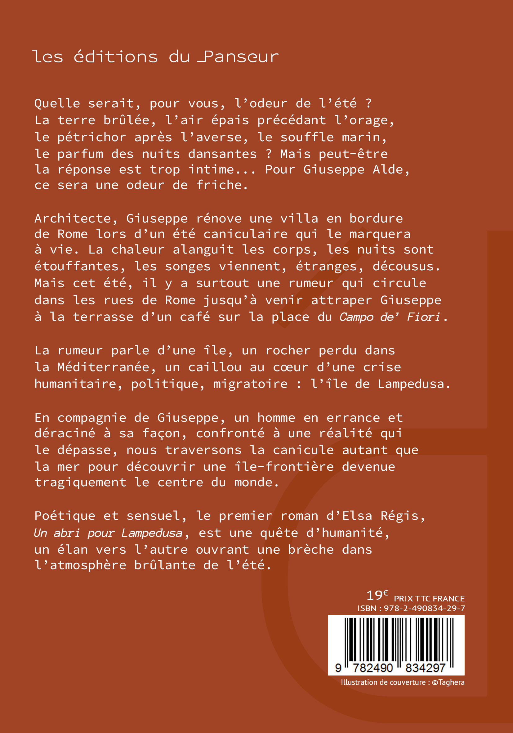 Architecte, Giuseppe rénove une villa en bordure de Rome lors d'un été caniculaire qui le marquera à vie. La chaleur alanguit les corps, les nuits sont étouffantes, les songes viennent, étranges, décousus. Mais cet été, il y a surtout une rumeur qui circule dans les rues de Rome jusqu'à venir attraper Giuseppe à la terrasse d'un café sur la place du Campo de' Fiori. La rumeur parle d'une île, un rocher perdu dans la Méditerranée, un caillou au coeur d'une crise humanitaire, politique, migratoire : l'île de Lampedusa. En compagnie de Giuseppe, un homme en errance et déraciné à sa façon, confronté à une réalité qui le dépasse, le lecteur traverse la canicule des journées romaines autant que la mer pour découvrir l'île de Lampedusa devenue tragiquement le centre du monde.Poétique et sensuel, le premier roman d'Elsa Régis, Un abri pour Lampedusa, est une quête d'humanité, un élan vers l'autre ouvrant une brèche dans l'atmosphère brulante et pesante de l'été. L'autrice nous emporte par son écriture langoureuse, flottante, envoutante, faite de silence, de sensualité dans les tensions discrètes entre les personnages (romance et bromance à la fois), corps qui se frôlent à peine et se tiennent à distance, une sorte de détachement dont se dégage pourtant une grande émotion et sensibilité, comme si le narrateur manquait de mots, ou de courage pour les trouver. Nous plongeons ainsi dans une lecture caniculaire, poétique et mélancolique pour explorer l'amitié, l'amour et la solidarité.
