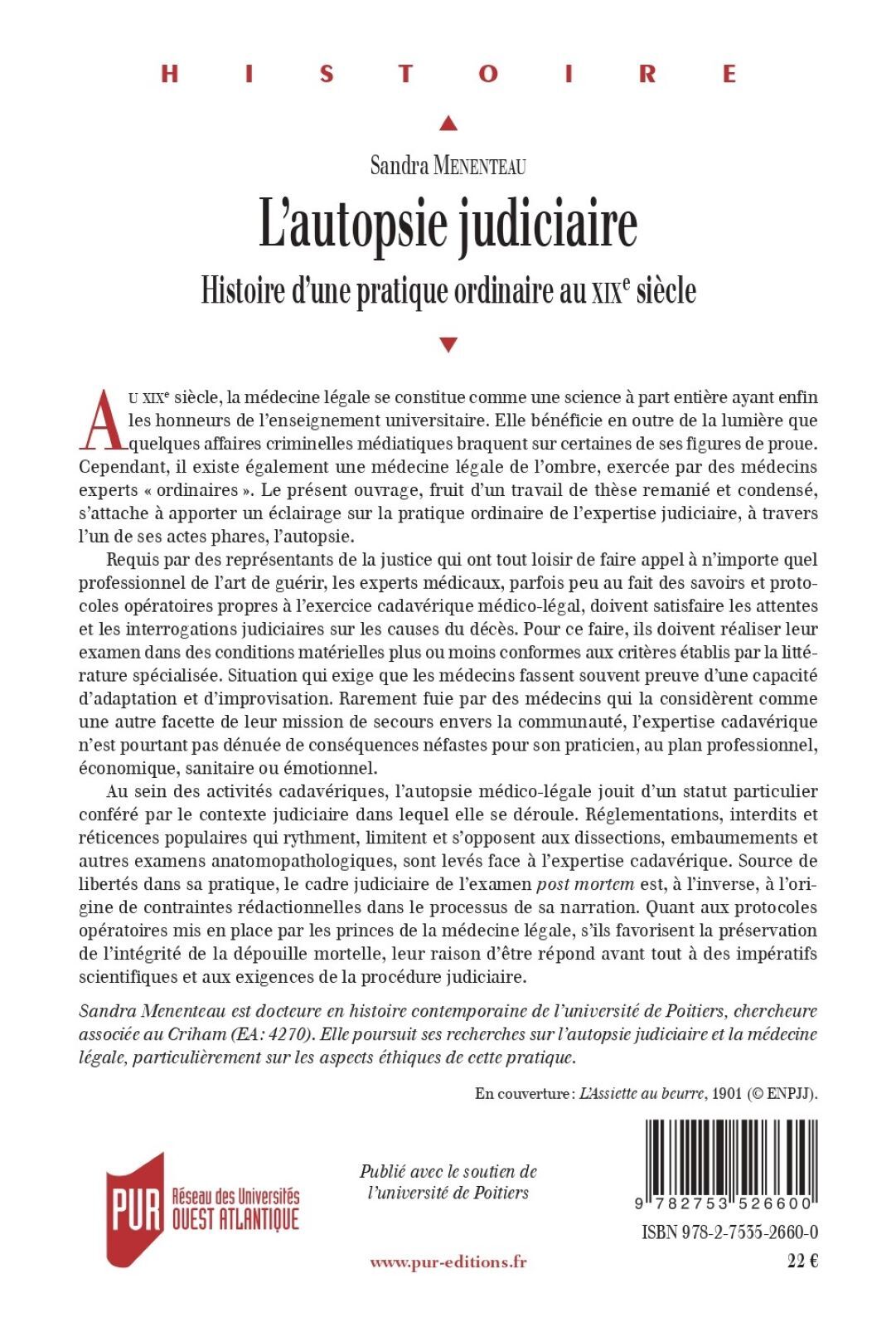 Au XIXe siècle, la médecine légale se constitue comme une science à part entière ayant enfin les honneurs de l’enseignement universitaire. Elle bénéficie en outre de la lumière que quelques affaires criminelles médiatiques braquent sur certaines de ses figures de proue. Cependant, il existe également une médecine légale de l’ombre, exercée par des médecins experts « ordinaires ». Le présent ouvrage, fruit d’un travail de thèse remanié et condensé, s’attache à apporter un éclairage sur la pratique ordinaire de l’expertise judiciaire, à travers l’un de ses actes phares, l’autopsie.Requis par des représentants de la justice qui ont tout loisir de faire appel à n’importe quel professionnel de l’art de guérir, les experts médicaux, parfois peu au fait des savoirs et protocoles opératoires propres à l’exercice cadavérique médico-légal, doivent satisfaire les attentes et les interrogations judiciaires sur les causes du décès. Pour se faire, ils doivent réaliser leur examen dans des conditions matérielles plus ou moins conformes aux critères établis par la littérature spécialisée. Situation qui exige que les médecins fassent souvent preuve d’une capacité d’adaptation et d’improvisation. Rarement fuie par des médecins qui la considèrent comme une autre facette de leur mission de secours envers la communauté, l’expertise cadavérique n’est pourtant pas dénuée de conséquences néfastes pour son praticien, au plan professionnel, économique, sanitaire ou émotionnel.Au sein des activités cadavériques, l’autopsie médico-légale jouit d’un statut particulier conféré par le contexte judiciaire dans lequel elle se déroule. Réglementations, interdits et réticences populaires qui rythment, limitent et s’opposent aux dissections, embaumements et autres examens anatomopathologiques, sont levés face à l’expertise cadavérique. Source de libertés dans sa pratique, le cadre judiciaire de l’examen post mortem est, à l’inverse, à l’origine de contraintes rédactionnelles dans le processus de sa narration. Quant aux protocoles opératoires mis en place par les princes de la médecine légale, s’ils favorisent la préservation de l’intégrité de la dépouille mortelle, leur raison d’être répond avant tout à des impératifs scientifiques et aux exigences de la procédure judiciaire.