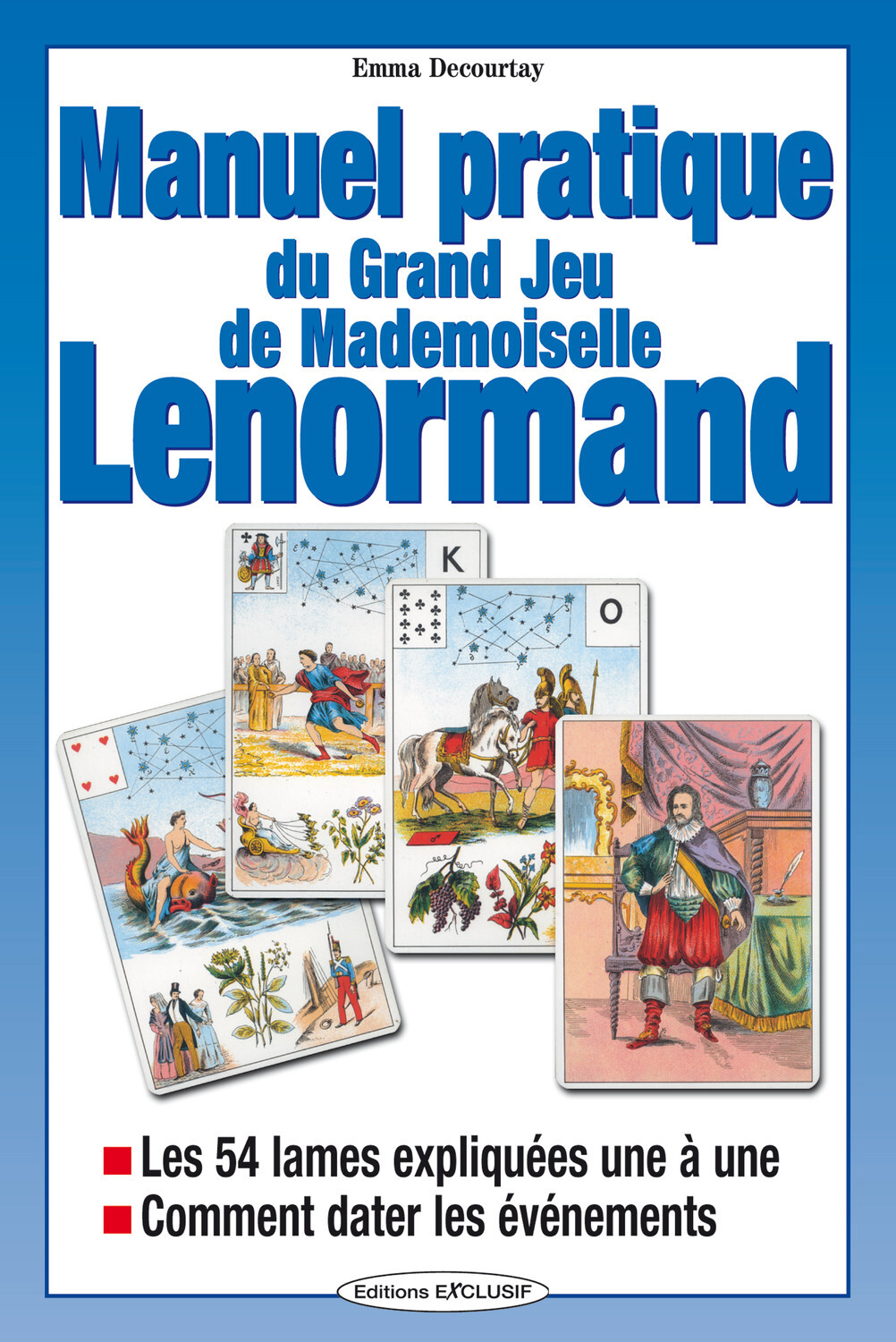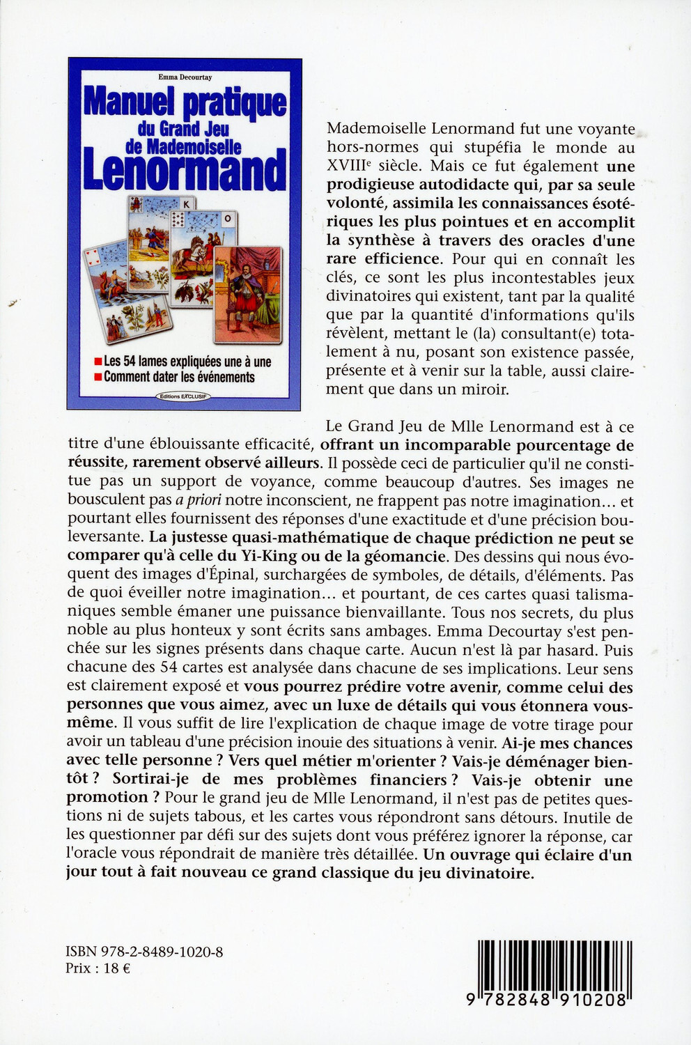 Le Grand jeu de Mlle Lenormand est à ce titre d'une éblouissante efficacité, offrant un incomparable pourcentage de réussite, rarement observé ailleurs. Il possède ceci de particulier qu'il ne constitue pas un support de voyance, comme beaucoup d'autres. Ses images ne bousculent pas a priori notre inconscient, ne frappent pas notre imagination... et pourtant elles fournissent des réponses d'une exactitude et d'une précision bouleversante. La justesse quasi-mathématique de chaque prédiction ne peut se comparer qu'à celle du Yi-King ou de la géomancie. Des dessins qui nous évoquent des images d'Épinal, surchargées de symboles, de détails, d'éléments. Pas de quoi éveiller notre imagination... et pourtant, de ces cartes quasi talismaniques semble émaner une puissance bienvaillante. Tous nos secrets, du plus noble au plus honteux y sont écrits sans ambages. Emma Decourtay s'est penchée sur les signes présents dans chaque carte. Aucun n'est là par hasard. Puis chacune des 54 cartes est analysée dans chacune de ses implications. leur sens est clairement exposé et vous pourrez prédire votre avenir, comme celui des personnes que vous aimez, avec un luxe de détails qui vous étonnera vous-même. Il vous suffit de lire l'explication de chaque image de votre tirage pour avoir un tableau d'une précision inouïe des situations à venir. Ai-je mes chances avec telle personne ? Vers quel métier m'orienter ? Vais-je déménager bientôt ? Sortirai-je de mes problèmes financiers ? Vais-je obtenir une promotion ? Pour le grand jeu de Mlle Lenormand, il n'est pas de petites questions ni de sujets tabous, et les cartes vous répondront sans détours. Inutile de les questionner par défi sur des sujets dont vous préférez ignorer la réponse, car l'oracle vous répondrait de manière très détaillée.Un ouvrage qui éclaire d'un jour tout à fait nouveau ce grand classique du jeu divinatoire.