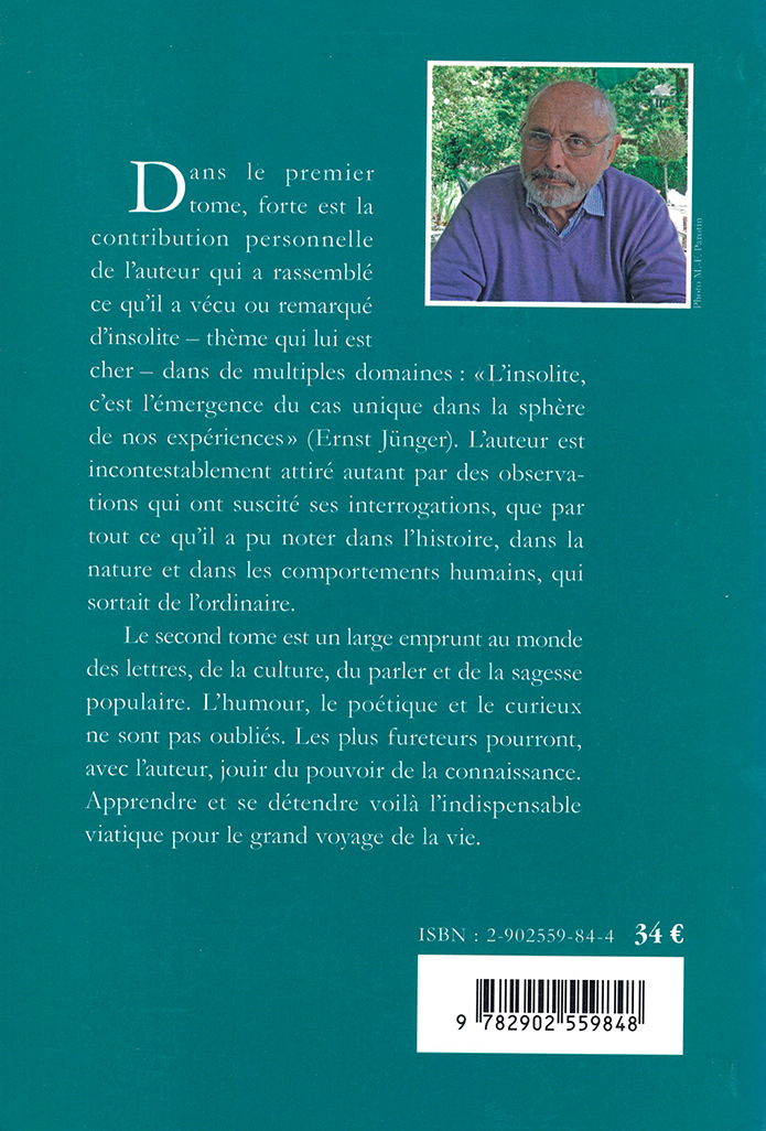 Dans le premier tome, forte est la contribution personnelle de l'auteur qui a rassemblé ce qu'il a vécu ou remarqué d'insolite - thème qui lui est cher - dans de multiples domaines : «L'insolite, c'est l'émergence du cas unique dans la sphère de nos expériences» (Ernst Jünger). L'auteur est incontestablement attiré autant par des observations qui ont suscité ses interrogations, que par tout ce qu'il a pu noter dans l'histoire, dans la nature et dans les comportements humains, qui sortait de l'ordinaire.Le second tome est un large emprunt au monde des lettres, de la culture, du parler et de la sagesse populaire. L'humour, le poétique et le curieux ne sont pas oubliés. Les plus fureteurs pourront, avec l'auteur, jouir du pouvoir de la connaissance. Apprendre et se détendre voilà l'indispensable viatique pour le grand voyage de la vie.