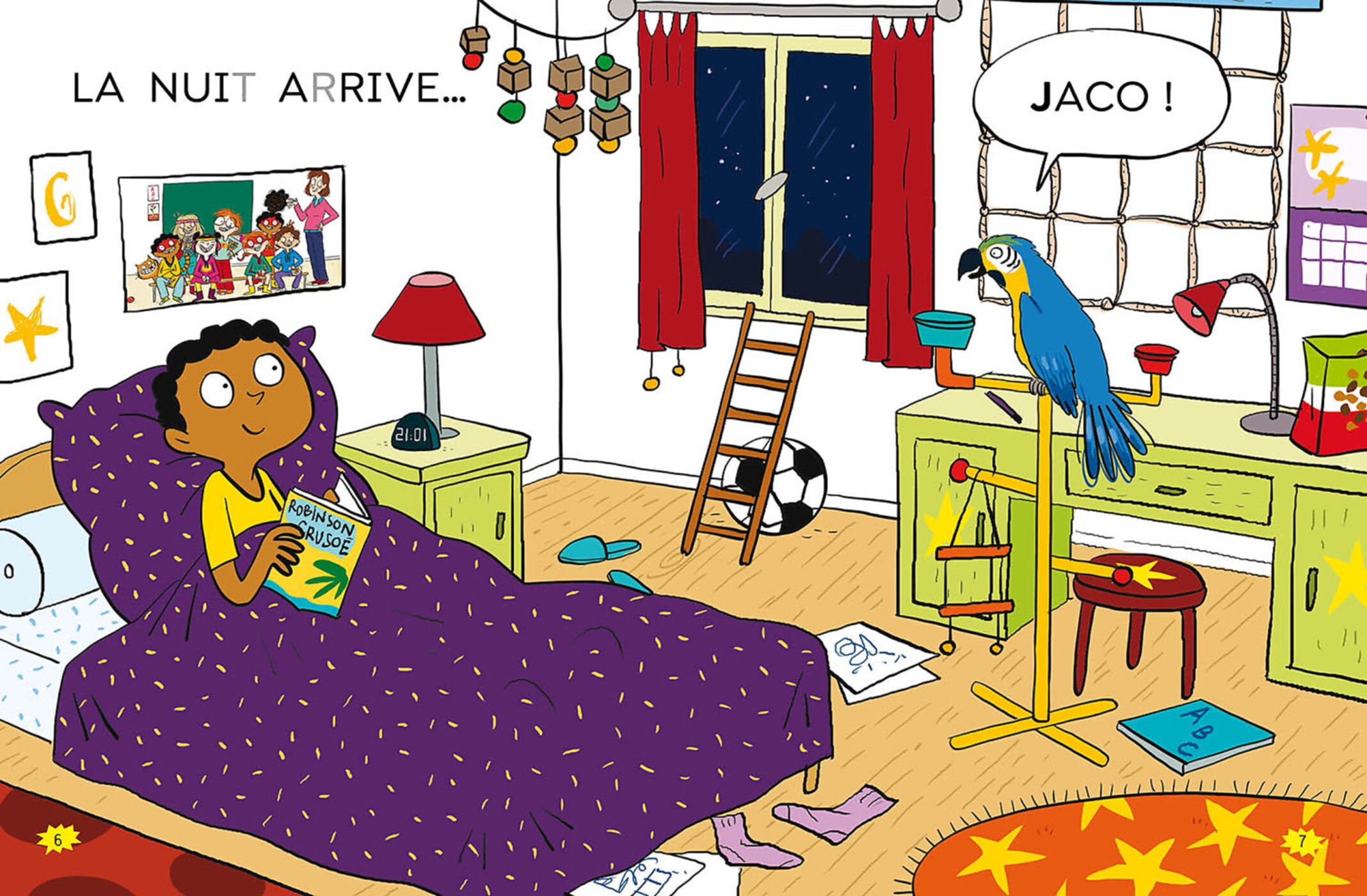 Lorsqu'il s'endort, Jules rejoint le mystérieux pays des rêves en volant sur le dos de son perroquet.
