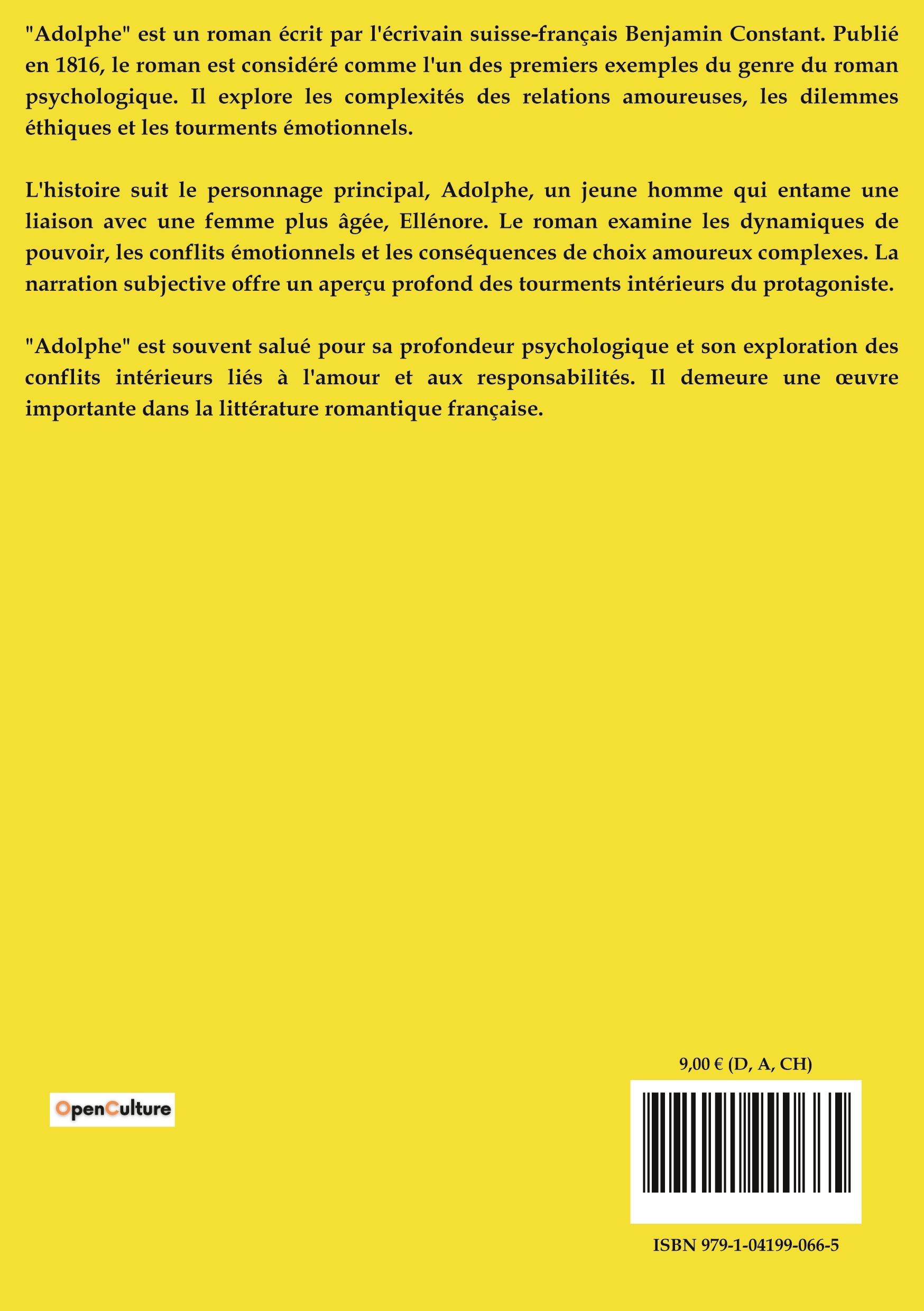 Adolphe est un roman écrit par l'écrivain suisse-français Benjamin Constant. Publié en 1816, le roman est considéré comme l'un des premiers exemples du genre du roman psychologique. Il explore les complexités des relations amoureuses, les dilemmes éthiques et les tourments émotionnels.